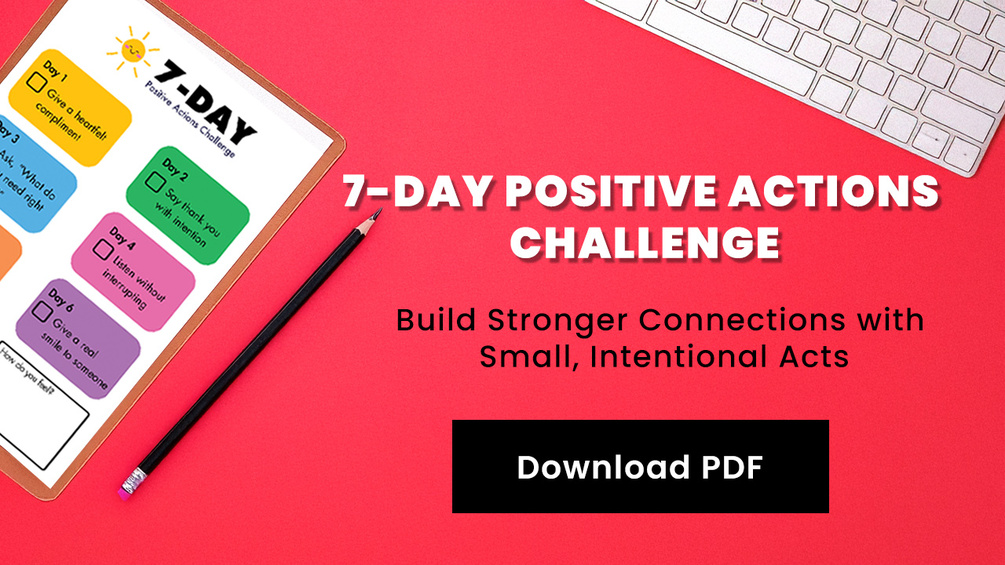 The 7-Day Positive Actions Challenge is a beautifully designed 1-page printable PDF featuring 7 thoughtful, connection-deepening tasks—each rooted in emotional intelligence and effective communication.